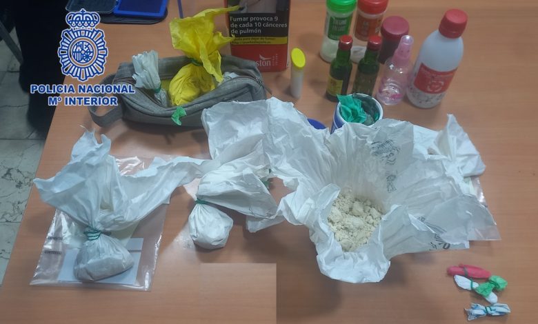 Una patrulla de la Policía Nacional observó sobre las cuatro y media de la madrugada un hombre que caminaba por la calle y que, al percatarse de la presencia policial, trató de ocultarse, lo que levantó sospechas en los agentes, que le abordaron y le preguntaron el motivo por el que estaba en la calle de madrugada. La actitud nerviosa del hombre y el que no diera una explicación clara llevó a los agentes a registrar una mochila que llevaba a la espalda, encontrando varias sustancias envueltas en bolsas de plástico. En una comprobación minuciosa se constató que la mochila contenía 306 gramos de anfetamina, 31 gramos de heroína y casi 23 gramos de hachís, dispuestos en dosis para su venta al menudeo. Además, en la mochila encontraron también un teléfono móvil, una libreta con anotaciones y cinco tarjetas bancarias de personas diferentes, cuya procedencia ahora investiga el cuerpo policial.