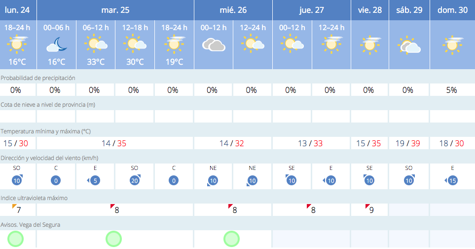 Previsión meteorológica de la Aemet para esta semana en Alcantarilla, publicada el lunes por la noche