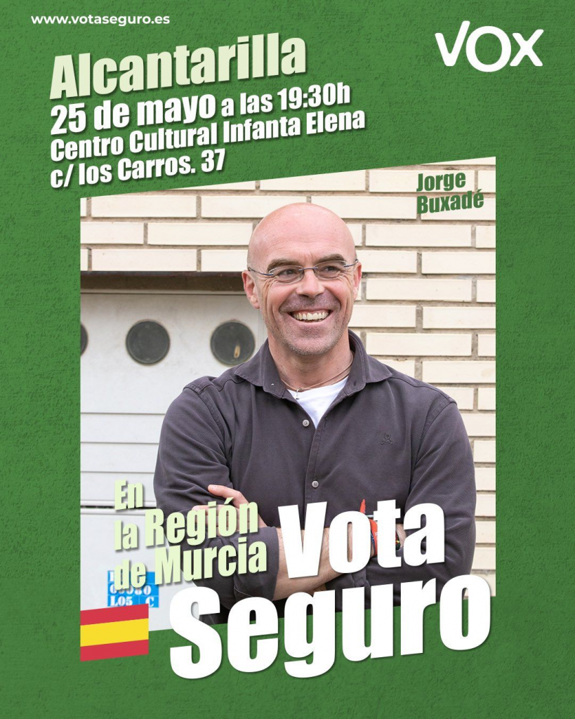 Jorge Buxadé, vicepresidente nacional de Vox, protagoniza hoy jueves en Alcantarilla el acto central de campaña electoral de Vox. El acto tendrá lugar en el centro cultural Infanta Elena a las 19:30 h.