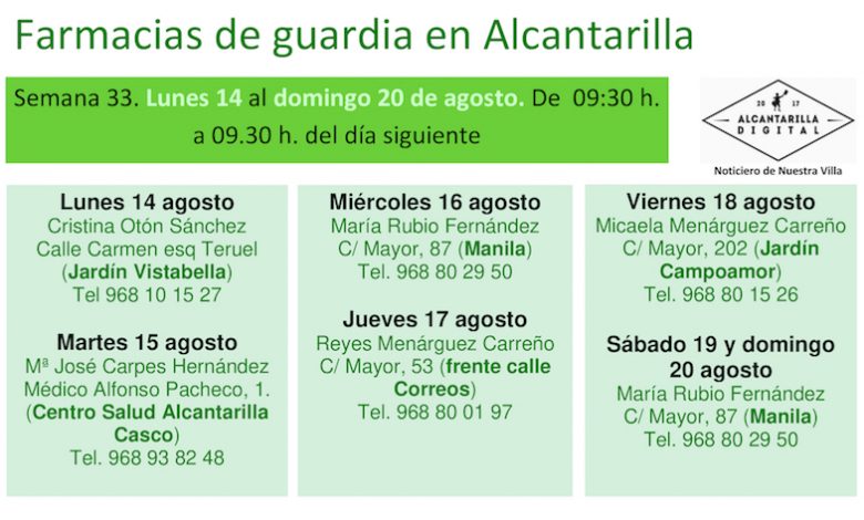 Farmacias de guardia en Alcantarilla del lunes 14 al domingo 20 de agosto de 2023. De 9:30 h. a 9:30 h. del día siguiente.
