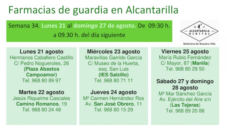 Farmacias de guardia en Alcantarilla del lunes 21 al domingo 27 de agosto de 2023. De 9:30 h. a 9:30 h. del día siguiente.