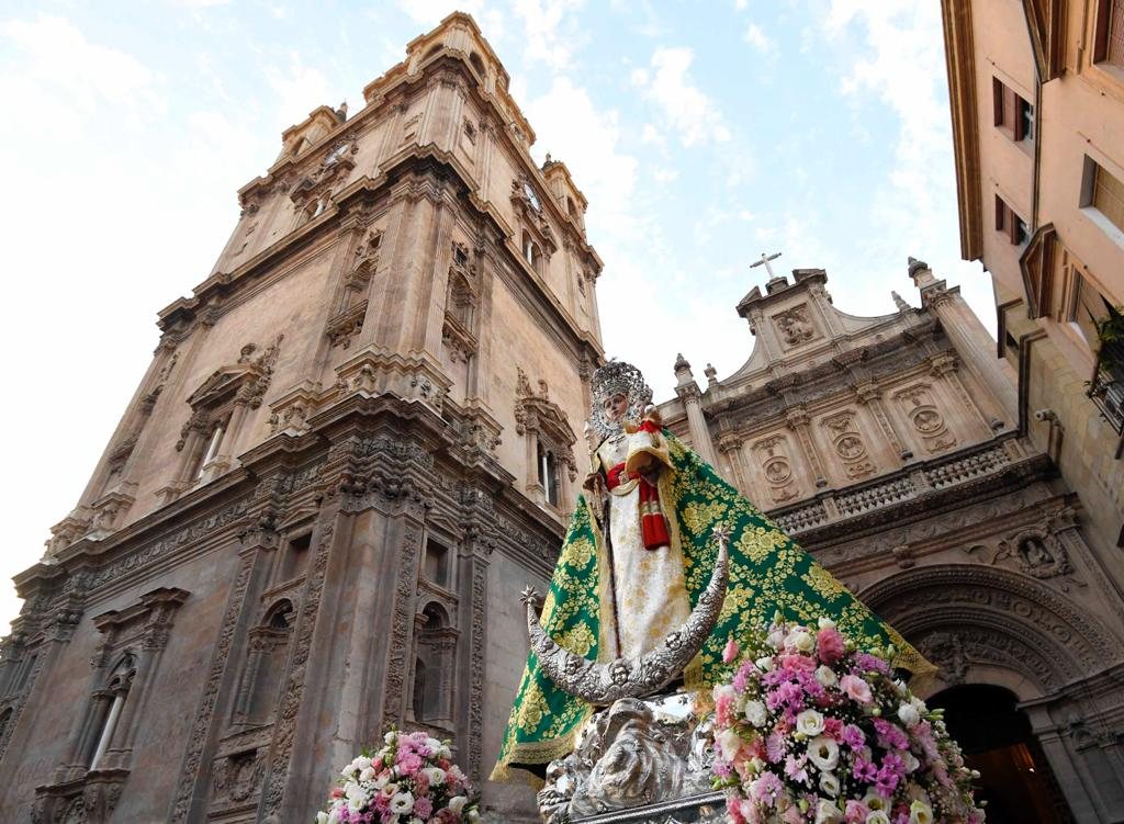 La Virgen de la Fuensanta, portada por sus caballeros y ataviada con un manto verde esperanza, ha abandonado el templo por la puerta de la plaza de la Cruz, en lugar de por la puerta de San José, debido a las obras de restauración del imafronte que se están acometiendo desde hace unas semanas.