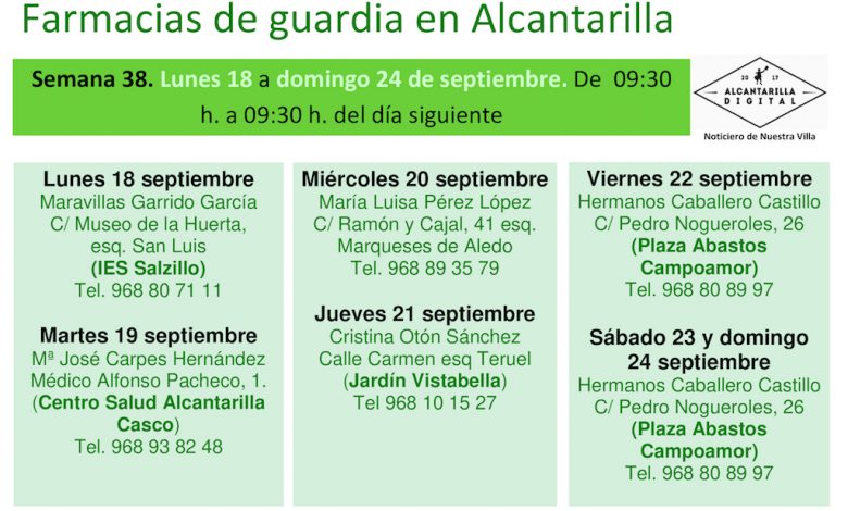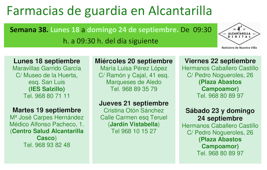 Farmacias de guardia en Alcantarilla del lunes 19 al domingo 24 de septiembre de 2023. De 9:30 h. a 9:30 h. del día siguiente.