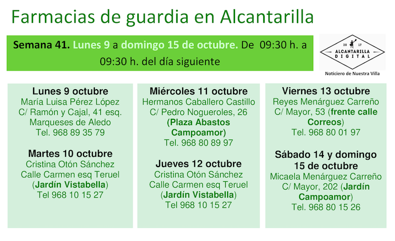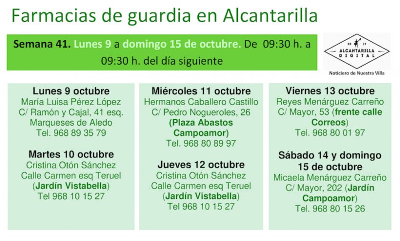 Farmacias de guardia en Alcantarilla del lunes 9 al domingo 15 de octubre de 2023. De 9:30 h. a 9:30 h. del día siguiente.