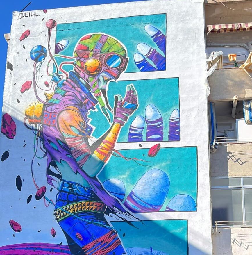 Los finalistas de este concurso son Said Sabir, de Barcelona; Krudo Pérez, de Madrid; y Emi y Trazos, de Campos del Río. Y fuera de concurso, artistas internacionales invitados también pintan sus murales. Los invitados este año son Dante Arcade, Angel Toren y Deih, que están terminando sus obras.