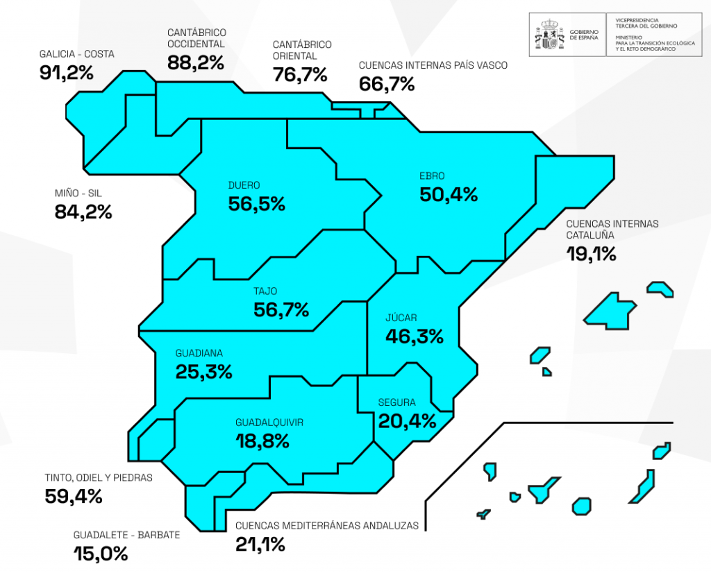 La situación de la Región contrasta con la de buena parte de España. Por ejemplo, en Galicia llevan dos semanas que prácticamente no ha parado de llover y en buena parte del centro peninsular ‘disfrutan’ de bajas temperaturas. Y los pantanos desaguando como medida de seguridad. Galicia está al 91,2% de su capacidad de embalse, el Cantábrico Occidental al 88,2%, el Oriental al 76,7%, el Tajo al 56,7% y el Ebro al 50,4%, como ejemplos. Sólo las cuencas del Guadalete (15,0%), Guadalquivir (18,8%) y cuencas interiores de Cataluña (19,1%) tienen menos agua embalsada (respecto a su capacidad) que la del Segura.