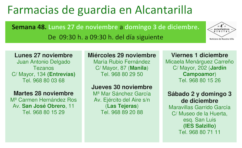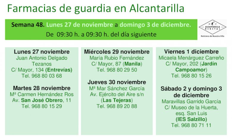 Farmacias de guardia en Alcantarilla del lunes 27 de noviembre al domingo 3 de diciembre de 2023. De 9:30 h. a 9:30 h. del día siguiente.