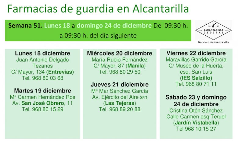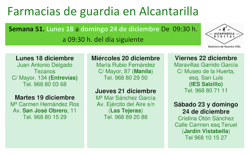 Farmacias de guardia en Alcantarilla del lunes 18 al domingo 24 de diciembre de 2023. De 9:30 h. a 9:30 h. del día siguiente.
