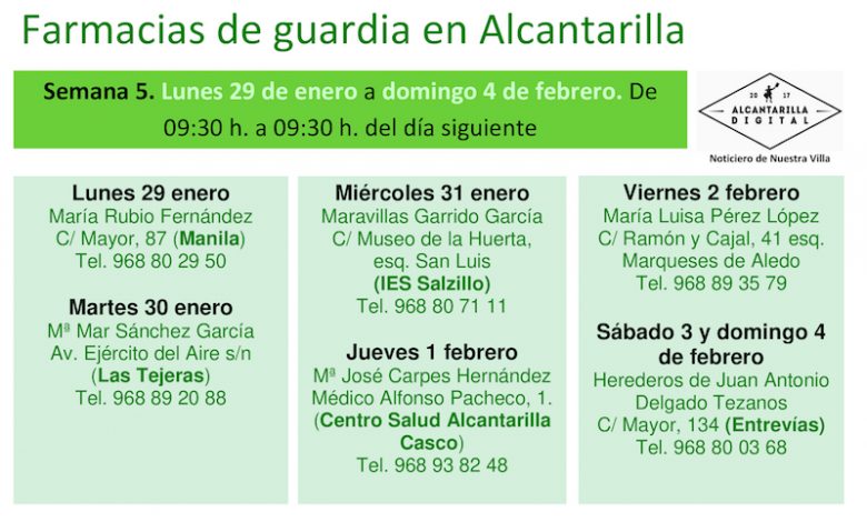 Farmacias de guardia en Alcantarilla del lunes 29 de enero al domingo 4 de febrero de 2024. De 9:30 h. a 9:30 h. del día siguiente.