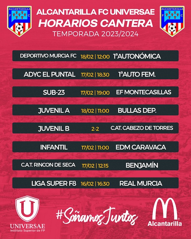 El Primera Autonómica Femenina será el único de los cuatro equipos del Alcantarilla FC Universae que este fin de semana jugará en casa. Los otros tres salen de casa en busca de mejorar su posición (el Tercera), consolidarla (el Primera Autonómica Femenina) o salvarse del descenso (el Primera Autonómica y el Preferente Autonómica Femenina).