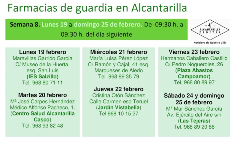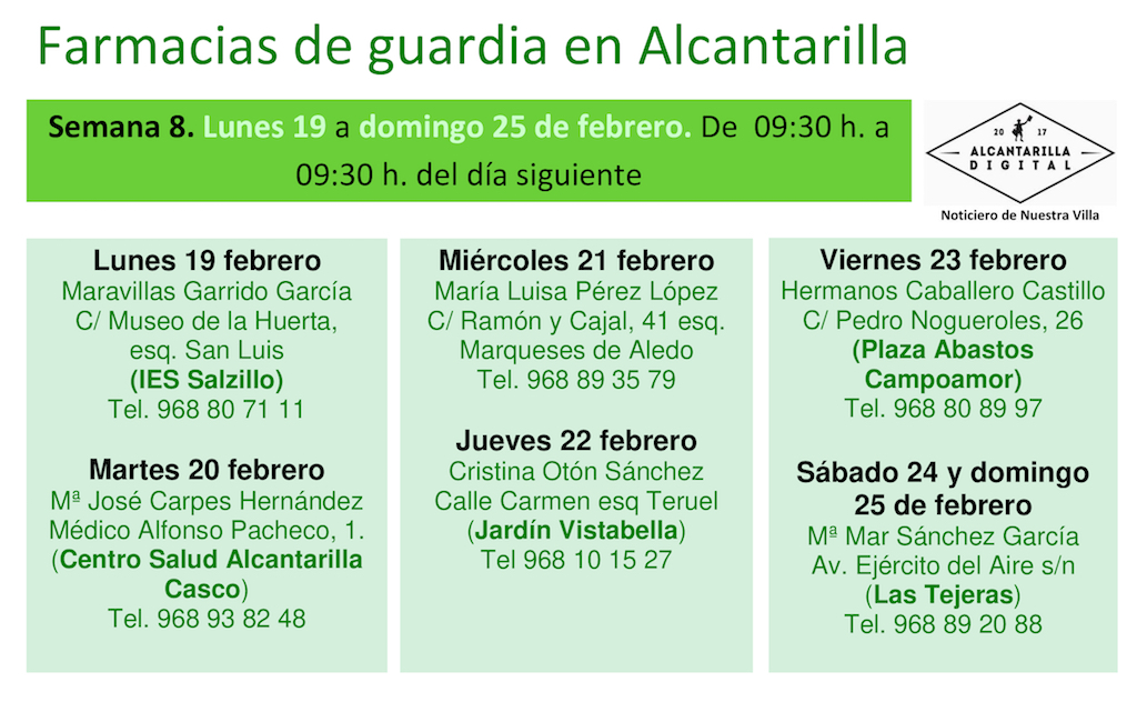 Farmacias de guardia en Alcantarilla del lunes 19 al domingo 25 de febrero de 2024. De 9:30 h. a 9:30 h. del día siguiente.