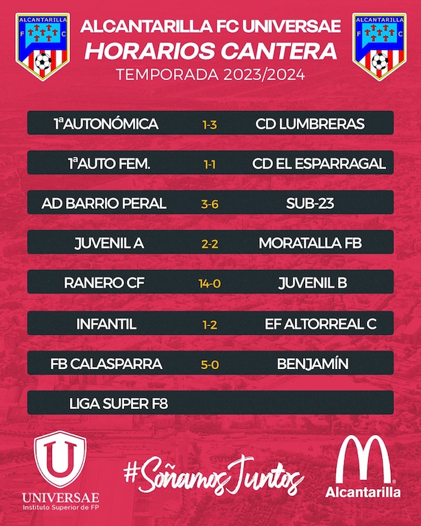 El resto de equipos de la cantera no tuvieron suerte. El Juvenil A lograba el empate en casa frente al Moratalla FB, el Juvenil B sufrió una goleada de 14-0 en su visita a El Ranero CF, el Infantil perdía en casa ante el EF Altorreal C por 1-2 y el Benjamín también recibió goleada en su visita al CB Calasparra (5-0).