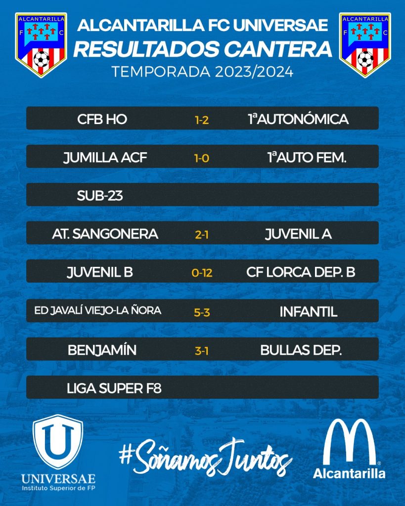 Jornada de claroscuros para los equipos del Alcantarilla FC Universae. Tres de los cuatro equipos de competición jugaban fuera de casa y dos han conseguido victoria y otros dos vuelven con la manos vacías.