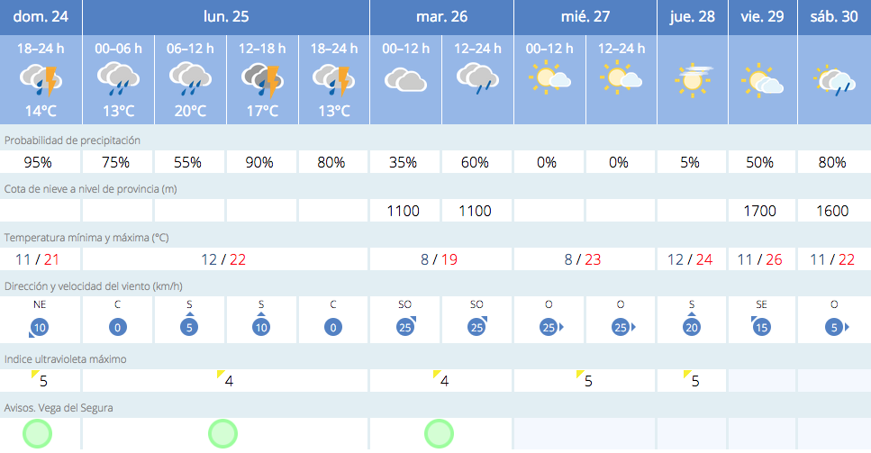 La previsión de la Aemet para Alcantarilla es clara: lluvia durante todo el día, incluida la tarde-noche, lo que puede afectar a la procesión de la Misericordia programada para hoy, Lunes Santo, a las 20.00 h. El recorrido previsto parte de la iglesia de San Roque, con la imagen del Santísimo Cristo de Salud y Misericordia, acompañado por el Santo Lignum Crucis y Nuestra Señora de la Consolación.