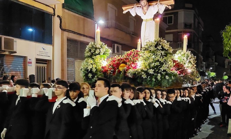 La primera Hermandad en desfilar es la de San Pedro Apóstol, con su titular, seguido del Santísimo Cristo de la Esperanza, conocido como el ‘Cristo de los Estudiantes’, porque son los alumnos de los centros de educación secundaria del municipio quienes portan el trono, que sale del Instituto Francisco Salzillo y se une al cortejo en el cruce de las calles Subida de San Francisco con Ramón y Cajal, a la llegada de su hermandad.