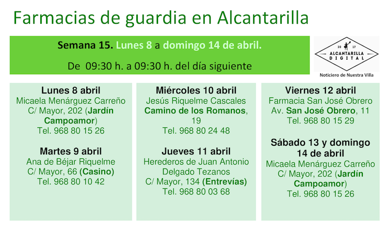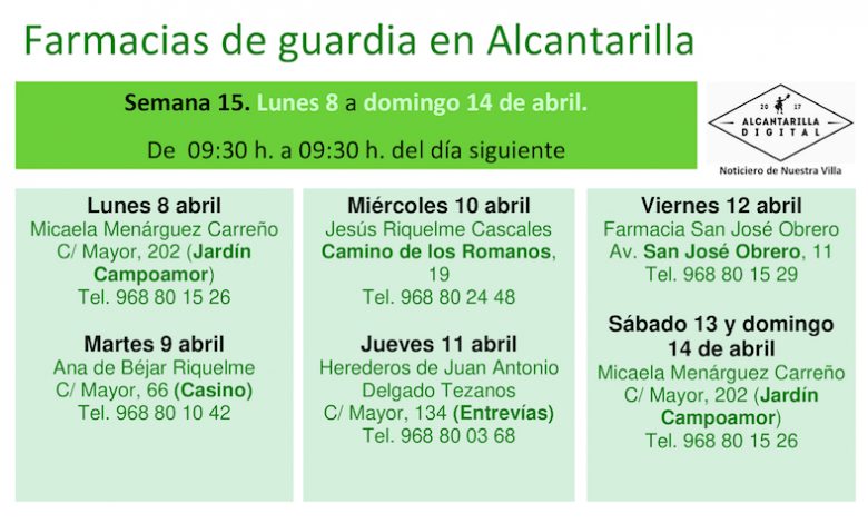 Farmacias de guardia en Alcantarilla del lunes 8 al domingo 14 de abril de 2024. De 9:30 h. a 9:30 h. del día siguiente.