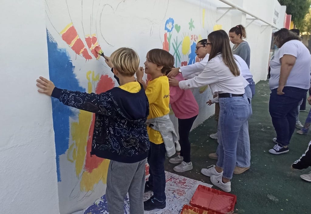 Otra de las actividades es la elaboración de un mural que representa los derechos de la infancia en el Parque de Educación Vial de Alcantarilla, en el que participan 132 estudiantes de Educación Infantil y Primaria y de los módulos de FP de Intervención Social y de Educación Infantil, dirigidos por la artista Lucía Viudez.