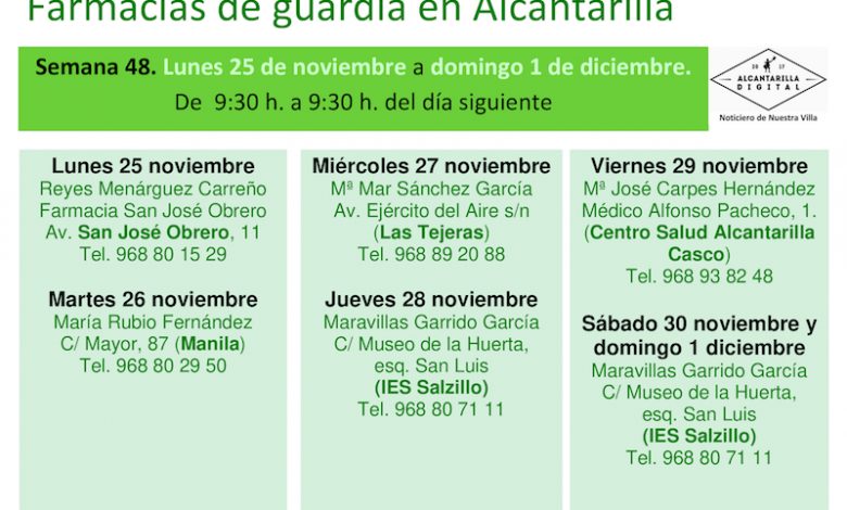 Farmacias de guardia en Alcantarilla del lunes 25 de noviembre al domingo 1 de diciembre de 2024. De 9:30 h. a 9:30 h. del día siguiente.