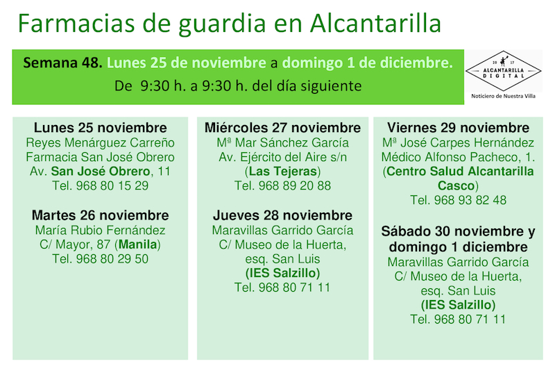 Farmacias de guardia en Alcantarilla del lunes 25 de noviembre al domingo 1 de diciembre de 2024. De 9:30 h. a 9:30 h. del día siguiente.