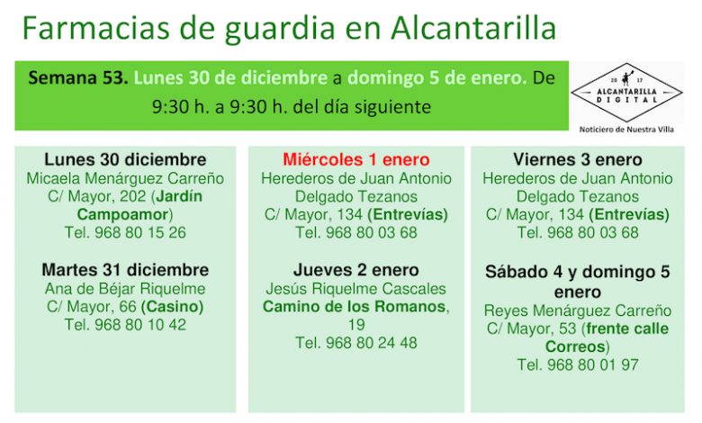 Farmacias de guardia en Alcantarilla del lunes 30 de diciembre de 2024 al domingo 5 de enero de 2025. De 9:30 h. a 9:30 h. del día siguiente.