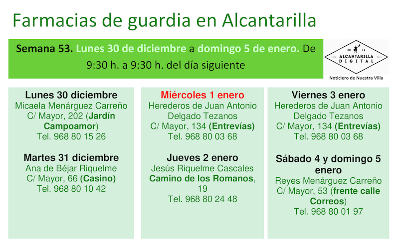 Farmacias de guardia en Alcantarilla del lunes 30 de diciembre de 2024 al domingo 5 de enero de 2025. De 9:30 h. a 9:30 h. del día siguiente.