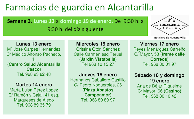 Farmacias de guardia en Alcantarilla del lunes 13 al domingo 19 de enero de 2025. De 9:30 h. a 9:30 h. del día siguiente.