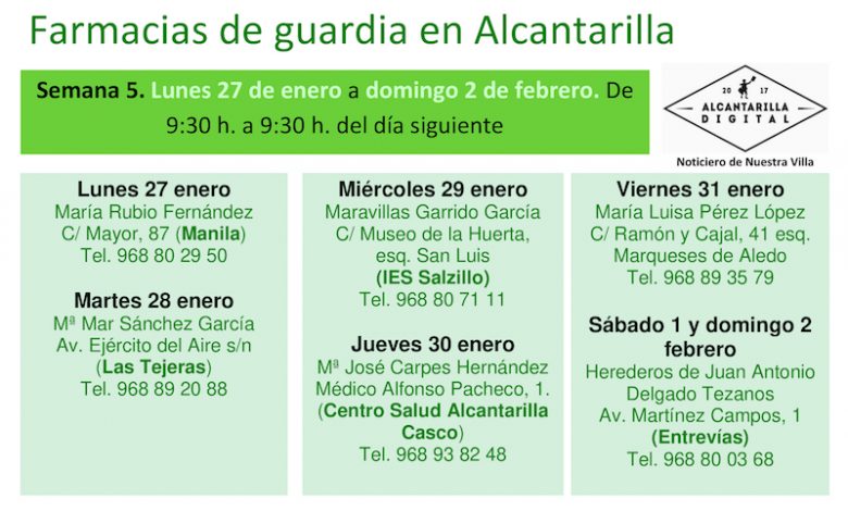 Farmacias de guardia en Alcantarilla del lunes 26 de enero al domingo 2 de febrero de 2025. De 9:30 h. a 9:30 h. del día siguiente.