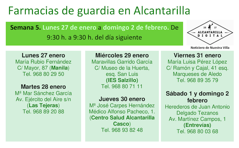 Farmacias de guardia en Alcantarilla del lunes 26 de enero al domingo 2 de febrero de 2025. De 9:30 h. a 9:30 h. del día siguiente.