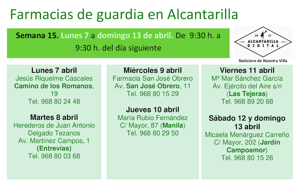 Farmacias de guardia en Alcantarilla del lunes 7 al domingo 13 de abril de 2025. De las 9:30 h. a las 9:30 h. del día siguiente.