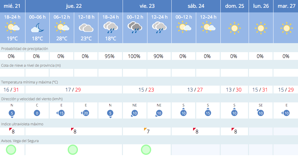 Tras estos días de calor, en que hemos llegado a los treinta grados centígrados, el jueves está previsto que desde las seis de la tarde hasta medianohe llueva, con un 95% de probabilidad. Para el jueves la temperatura prevista será calida aún.