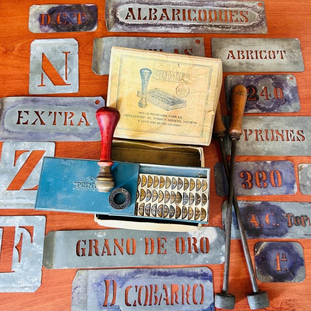 También hay material utilizado para su almacenaje, como unas planchas metálicas para marcar cajas o envases, soldadores de metales con mango de madera y una caja con el sello fechador Primus, que servía para el marcaje de timbres móviles, pólizas y efectos reintegrados, con el sello ‘Domingo Cobarro’.