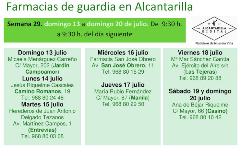 Farmacias de guardia en Alcantarilla del domingo 13 al domingo 20 de julio de 2025. De 9:30 h. a 9:30 h. del día siguiente.