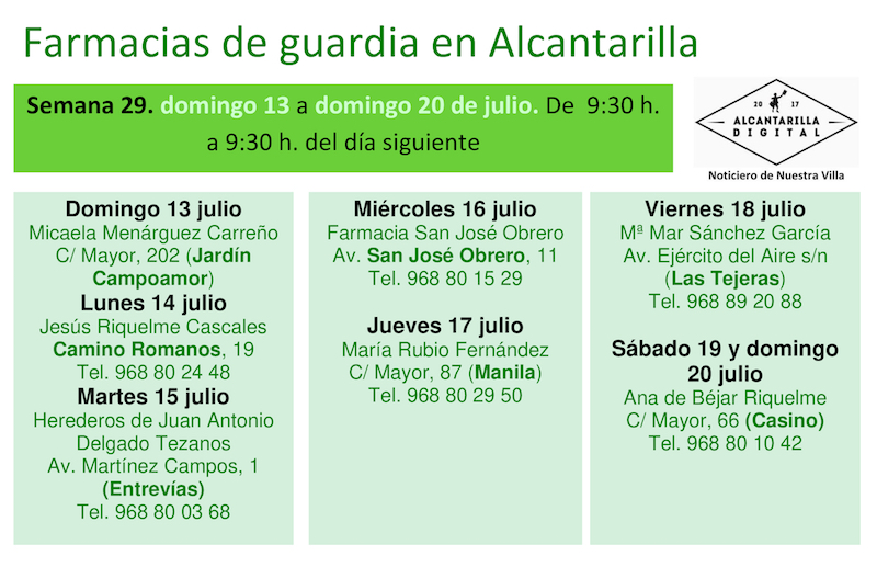 Farmacias de guardia en Alcantarilla del domingo 13 al domingo 20 de julio de 2025. De 9:30 h. a 9:30 h. del día siguiente.