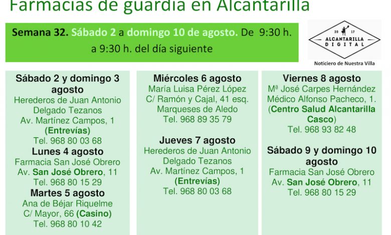 Farmacias de guardia en Alcantarilla del sábado 2 al domingo 10 de agosto de 2025. De 9:30 h. a 9:30 h. del día siguiente.