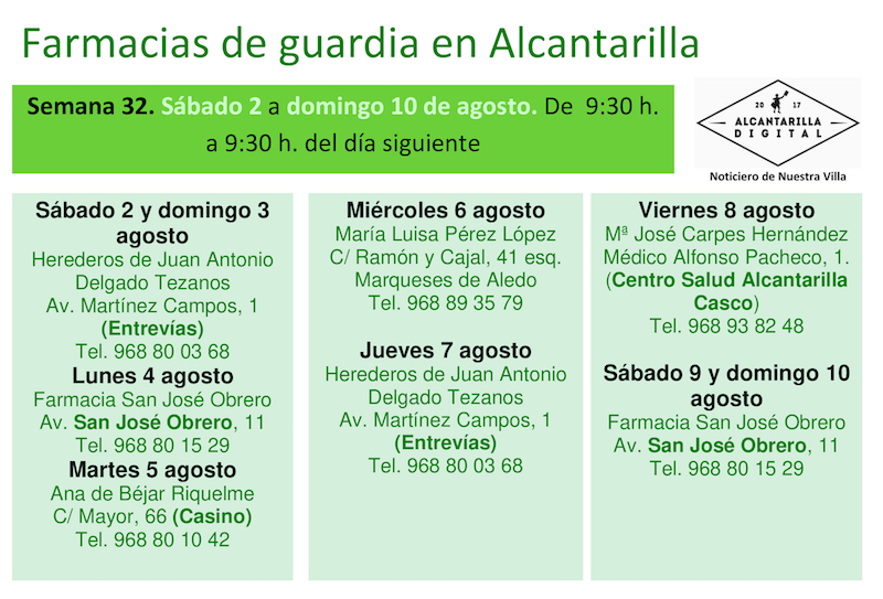 Farmacias de guardia en Alcantarilla del sábado 2 al domingo 10 de agosto de 2025. De 9:30 h. a 9:30 h. del día siguiente.