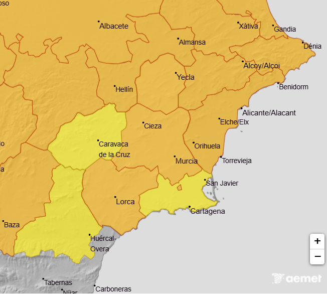 Alcantarilla llegará a los 44 grados centígrados de temperatura este domingo y lunes según la previsión de la Aemet, que ha activado aviso naranja por temperaturas extremas en buena parte de la Región para hoy sábado, y aviso rojo para mañana domingo. El aviso naranja afecta a las comarcas del Altiplano, Guadalentín y Vega del Segura (donde se encuentra Alcantarilla), lo que supone más de dos tercios de la Región, mientras que el Noroeste y la costa están en alerta amarilla. Es curioso ver que todo el entorno de la Región de Murcia en las comunidades andaluza, valenciana y castellano-manchega están el alerta naranja sin excepción.