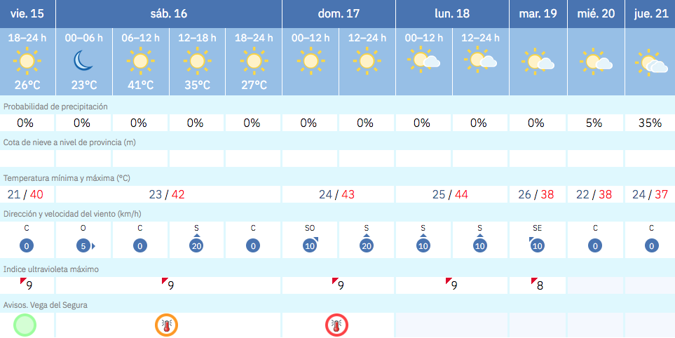 Según la previsión, este sábado llegaremos a los 43 grados y mañana domingo repetiremos los 43 grados pero con una temperatura mínima más elevada. El lunes alcanzaremos los 44 grados, a falta de afinar más la previsión según se acerque la fecha y las posibles alertas.
