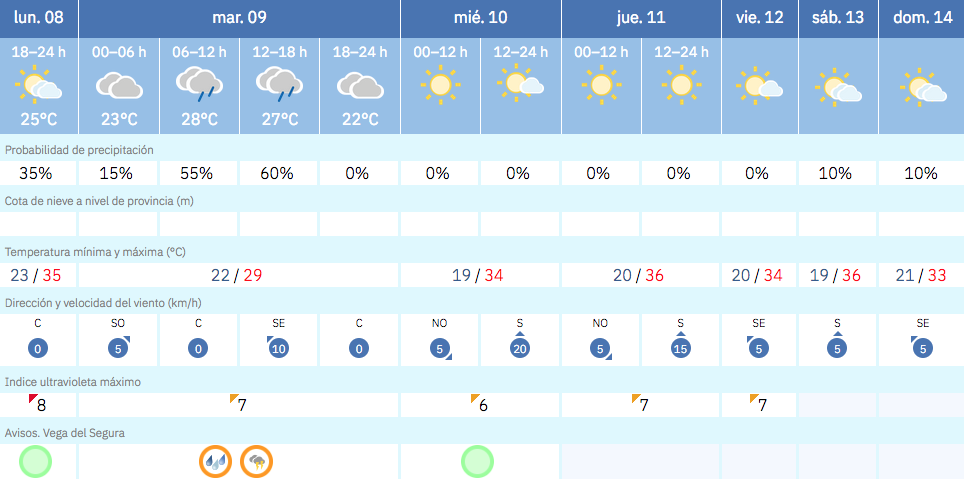 De todas formas, la probabilidad de que estas lluvias y tormentas descarguen en Alcantarilla es de entre el 40% y el 70%.