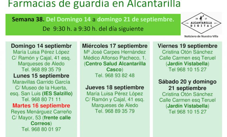 Farmacias de guardia en Alcantarilla del domingo 14 al domingo 21 de septiembre de 2025. De 9:30 h. a 9:30 h. del día siguiente.