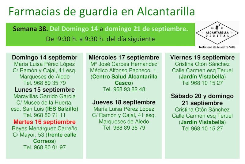 Farmacias de guardia en Alcantarilla del domingo 14 al domingo 21 de septiembre de 2025. De 9:30 h. a 9:30 h. del día siguiente.