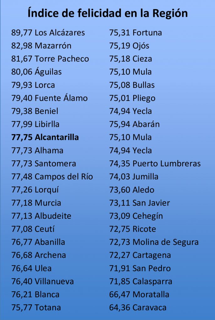 El municipio de Alcantarilla se encuentra entre los primeros de la Región en el Spain Happy Index o índice de la felicidad que elabora Sonneil Homes, una compañía inmobiliaria especializada en viviendas de seguida residencia. Los indicadores de este “índice de felicidad” son sobre todo el clima (días de sol, lluvia y viento al año), las comunicaciones y la cercanía de servicios sanitarios y educativos. Con estos criterios, especialmente el clima, las zonas sur, sureste y la insular de España ganan con diferencia. Y en nuestra Región, son sobre todo los municipios costeros los que tienen un mayor índice de felicidad, aunque Alcantarilla, totalmente interior, está entre los primeros. Sobre todo gracias a la cercanía a numerosos e importantes servicios sanitarios (hospitales), su buena comunicación y su buen clima, aunque no tengamos costa.