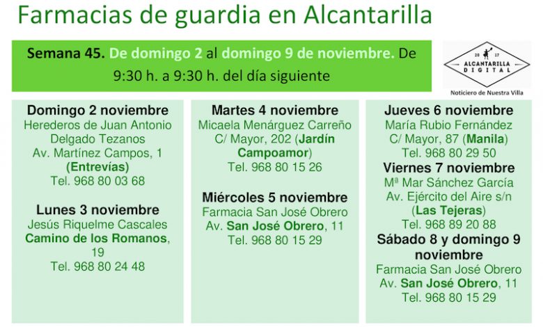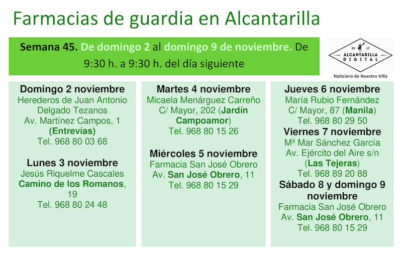 Farmacias de guardia en Alcantarilla del domingo 2 al domingo 9 de noviembre de 2025. De 9:30 h. a 9:30 h. del día siguiente.