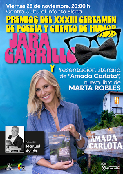 La entrega de premios es el 28 de noviembre en el Centro Cultural Infanta Elena y en ella los ganadores recibirán un premio de 2.500 euros, los accésit 1.200 euros y, junto con los finalistas y los autores de la anterior edición, formarán parte del volumen 14 de la colección Premios del Certamen Jara Carrillo. Antes de la ceremonia de entrega de premios, la periodista Marta Robles presenta su última novela, ‘Amada Carlota’.