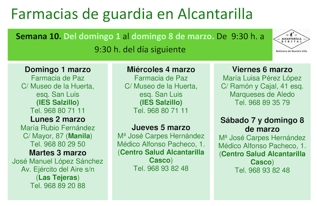 Farmacias de guardia del domingo 1 al domingo 8 de marzo de 2026. De 9:30 h. a 9:30 h. del día siguiente.